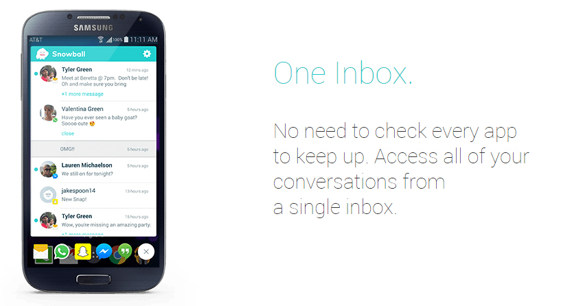 หลักการของ Snowball ก็คือ ตัวมันเองจะเป็นศูนย์กลางของ App Chat หลายๆตัวด้วยกัน ตอนนี้ที่รองรับก็คือ SMS / Facebook Messenger / Whatsapp / Snapchat / Google Hangout / WeChat และคาดว่าในอนาคตจะมีเพิ่มอีกหลายตัวเลยทีเดียว