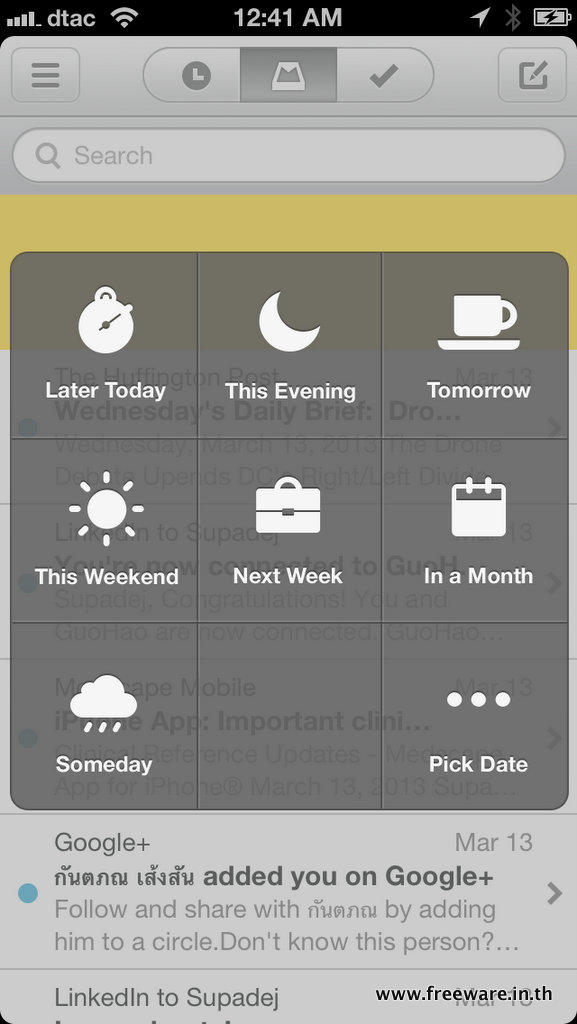 ถัดมาก็คือ ความสามารถในการตั้งเวลา เพื่อไปจัดการอีเมล์ฉบับนั้นทีหลัง อันนี้คนที่ทำงานแบบที่ต้องเจอลูกค้าหลายๆเจ้า น่าจะเจอบ่อย จะมีอีเมล์แปลกๆโผล่มาในเวลาแปลกๆ ซึ่งยังทำงาน ณ เวลานั้นไม่ได้ แต่พอเห็นแล้วก็หงุดหงิด .. ซึ่งด้วย Mailbox คุณสามารถส่งมันไปอนาคตให้มันหายไปเลย แล้วกลับมาเจอหน้ากันอีกทีตอนเวลาที่กำหนดไว้ครับ เช่น มีคนส่งอีเมล์งานทวงงานตอนกินข้าวเช้าอยู่ เราก็ส่งมันไปในอนาคตซะ ให้มาเจอกันอีกทีตอนบ่าย ซึ่งตอนนั้นอยู่ที่ทำงานแล้วอะไรแบบนี้ครับ