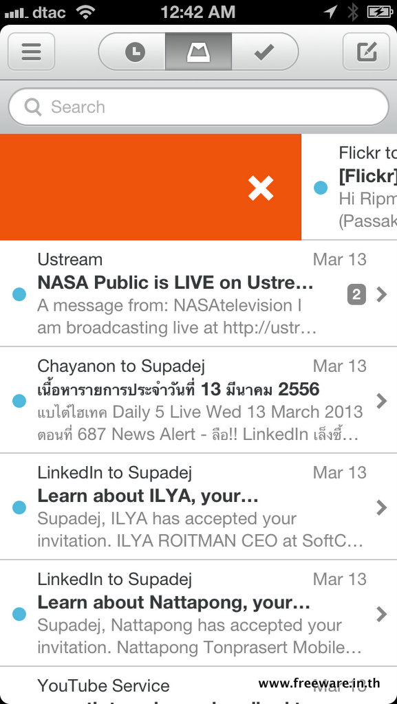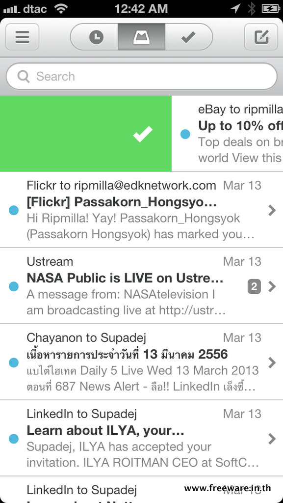 ความเจ๋งอีกอย่างในการใช้งาน Mailbox ก็คือ เราสามารถใช้แค่นิ้วปาด ซ้าย – ขวา ได้ 2 ระดับ เพื่อสั่งการว่าจะทำอะไรกับ Email ฉบับนั้นครับ