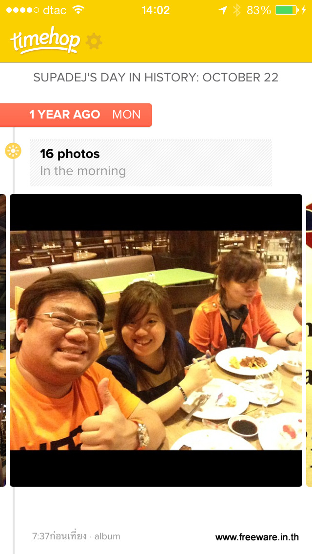 ไปเจอ App ตัวนึง เคยลงไว้นานแล้ว แต่ตอนนั้นยังไม่ได้อารมณ์การใช้งานซักเท่าไหร่เลย เพราะมันยังบ่มข้อมูลไม่ถึงที่ แต่ตอนนี้กลายเป็น App ที่ต้องเปิดวันละครั้งเลยล่ะครับ ชื่อของมันคือ Timhop หรือ กระโดดข้ามกาลเวลานั่นเอง