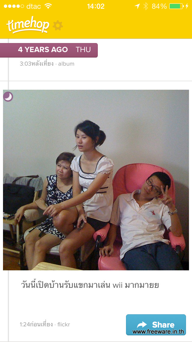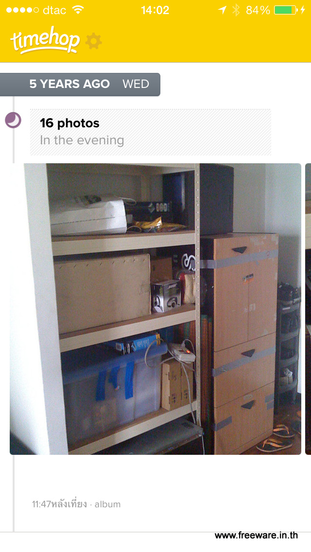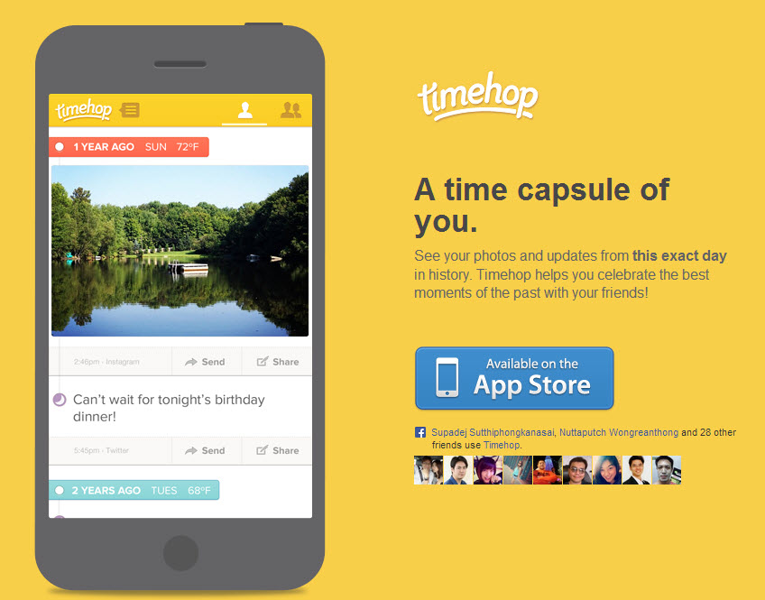 Timehop ใช้การเชื่อมตัวเองเข้ากับ Social Network ของเรา ไม่ว่าจะเป็น Instagram / Twitter / Facebook / Foursquare / Dropbox เพื่อลงไปขุดคุ้ยว่า คุณเคยอัพโหลดรูปอะไรไปบ้าง โดยที่ใน 1 วันทาง Timehop ก็จะอัพเดท 1 รอบแล้วก็ เอารูปเก่าๆของเราในวันนี้ เมื่อ 1 – 5 ปีก่อนมาให้ดู