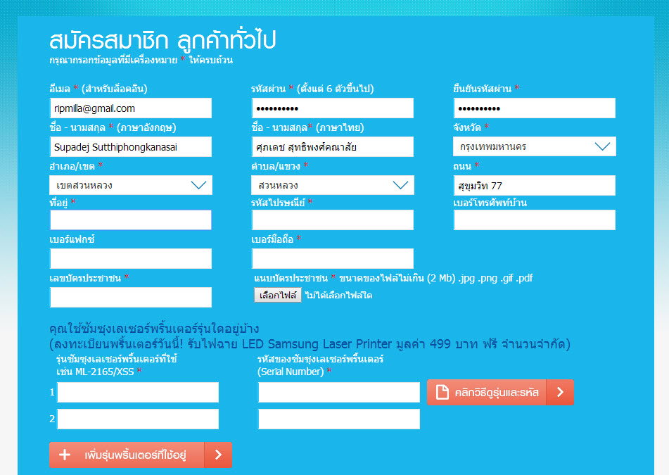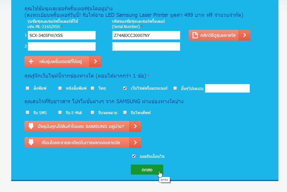 วิธีการก็คือเข้าไปลงทะเบียนที่ http://www.samsung.com/th/getmore/ ครับ กรอกชื่อ ที่อยู่ เบอร์โทรศัพท์ และ รุ่นของ Printer + Serial No. ที่เราซื้อมา เท่านั้นก็ได้แล้ว