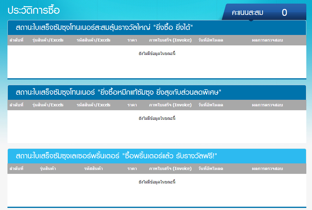 ในหน้านี้ก็จะสรุปสถานะให้ทั้งหมดเลยว่าคุณซื้ออะไรไปบ้าง แล้วจะนำไปแลกกับโปรโมชั่นได้บ้างครับ ซึ่งผมว่า ก็ดีนะ เพราะทุกที เวลาซื้อของเพื่อเอาโปรโมชั่นอะไรซักอย่าง มันก็จะหมดเป็นครั้งๆไป แต่นี่เป็นโครงการที่เราสะสมยอดซื้อของเราได้เรื่อยๆ อย่างสิ่งที่ใช้แล้วหมดไปอย่าง Toner ของ Printer ก็นับว่าไม่เลวเลยนะครับ ผู้ใช้ตามบ้านอาจจะรู้สึกไม่ค่อยเยอะ แต่องค์กรใหญ่มาลองใช้่โปรนี้ดู รับรองของแถมบาน ส่วนลดเพียบครับ