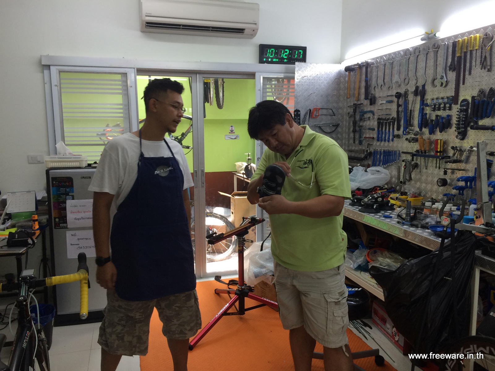 ห้อง Bike Fitting จะอยู่ที่ชั้น 2 ของร้าน ขั้นตอนแรกก็จะเอาจักรยานของคุณประกอบเข้ากับเทรนเนอร์ของทางร้านก่อน เพราะเดี๋ยวเราได้ปั่นกันลิ้นห้อยแน่