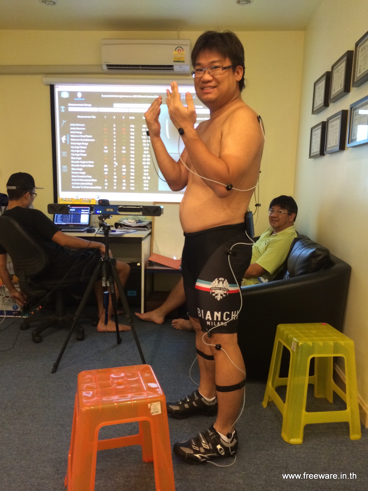 หลังจากที่วัดองศารถเสร็จแล้ว ก็ต้องมาติดอุปกรณ์ที่เรียกว่า dot ตามข้อต่อต่างๆของร่างกายผม ก็มีข้อมือ ศอก ไหล่ เอว หัวเข่า ข้อเท้า แล้วก็ปลายเท้าครับ