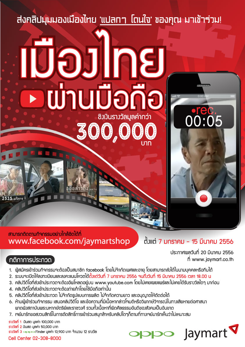 เป็นกิจกรรมที่เราจะได้ใช้โทรศัพท์มือถือของเราให้เป็นประโยชน์ครับ เมื่อทาง Jaymart ได้จัดกิจกรรมถ่ายวีดีโอเข้าประกวดในหัวข้อ “มองเมืองไทยผ่านมือถือ” ครับ งานนี้มีเงินรางวัลด้วย แถมใช้แค่มือถือกับ Facebook ก็เข้าร่วมกิจกรรมได้แล้วครับ