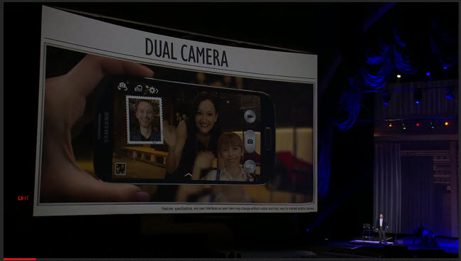 ก็เลยมีระบบ Dual Camera ครับ ตัว S4 ก็จะเปิดกล้องหน้า แล้วก็ถ่ายกล้องหลังไปพร้อมๆกัน ทำให้มีหน้าพ่อแปะ อยู่ในรูปด้วย แจ๋วมาก ใช้ได้ทั้งวีดีโอและภาพนิ่งนะครับ แถมย้ายกรอบรูปของพ่อ ไปตรงไหนของหน้าจอก็ได้