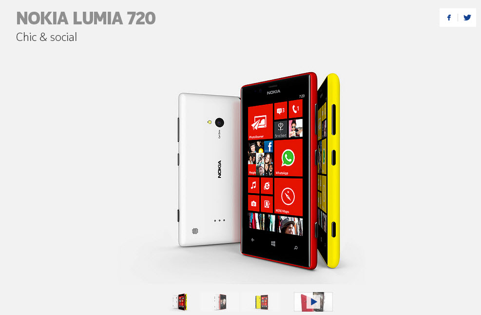 แน่นอนว่า แนะนำ Lumia 520 ไปแล้วก็ขอแนะนำ 720 ด้วย สิ่งที่อัพเกรดขึ้นมา นอกจาก CPU จากรุ่น 520 ก็คือ จอที่ใหญ่กว่าแถมเป็นจอ IPS แบบ Clearblack สามารถสู้แสงกลางแดดได้สบายๆ พร้อมเลนส์ Carl-Zeiss ที่ Wide ถึง 26มม และมีค่ารูรับแสงถึง f1.9 เรียกได้ว่า กินแสงน้อยมาก ทำให้ถ่ายที่มืดได้โคตรดี แล้วก็มีกล้องหน้ากับ NFC ที่เหลือไม่มีอะไรแตกต่างจาก 520 มากนัก แต่ในราคา 10,900 บาท ได้เลนส์เทพมาใช้ก็โคตรคุ้มแล้ว