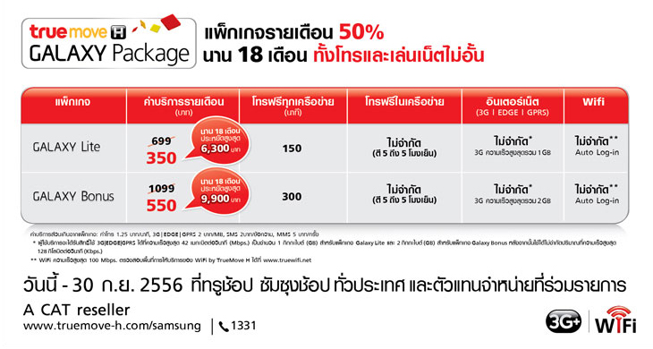 • Galaxy Lite ราคาเต็ม 699 บาท ลดเหลือ 350 บาท โทรฟรี ทุกเครือข่าย 150 นาที , โทรในเครือข่ายฟรีไม่จำกัด (เฉพาะช่วง ตี 5 – 5 โมงเย็น) , 3G ไม่จำกัด มี FUP 1GB และเมื่อหมด FUP จะลดความเร็วเหลือ 128kbps และสามารถใช้ True WIFI แบบ Auto Login ได้ด้วย
