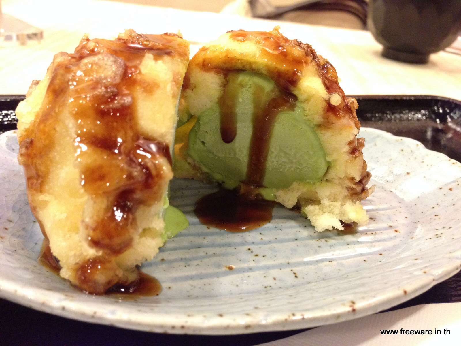 ปิดท้ายด้วยของหวานที่เป็นเอกลักษณ์ของร้านนี้ ไอศครีมชาเขียว ทอดกับแป้งเทมปุระ ราดทาเระซอส กับ ไอศครีมชาเขียวถั่วแดงโมจิในน้ำเต้าหู้ครับ ผมชอบไอศครีมในน้ำเต้าหู้มากกว่านะ อาจจะเพราะว่าหลังจากที่ซัดมาเต็มข้อ 4 ชามรวด การที่ได้กินน้ำเต้าหู้ปิดท้ายมันทำให้รู้สึกสบายลิ้นมากกว่าครับ