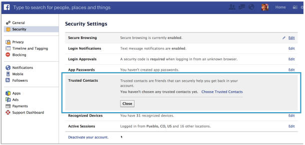 Trusted Contact คือความสามารถที่ทาง Facebook จะให้เราเลือกเพื่อนซี้สุดใจขาดดิ้นมา 3-5 คน โดยที่ทั้ง 3-5 คนนี้จะเป็นคนยืนยันตัวคุณในกรณีที่ คุณมีปัญหา Password โดน Hack , จำ password ตัวเองไม่ได้ ซึ่งน่าจะเหมาะกับบ้านเรานะ เพราะบ้านเราเนี่ย ตั้ง Password ไม่เคยจำ , ตั้งคำถามกู้รหัสผ่านก็ไม่เคยจำ ซึ่งผมจะปวดหัวมากเวลาโดนถามคำถามประมาณว่า “จำอะไรไม่ได้เลย จะเข้า Facebook ยังไงดีครับ”