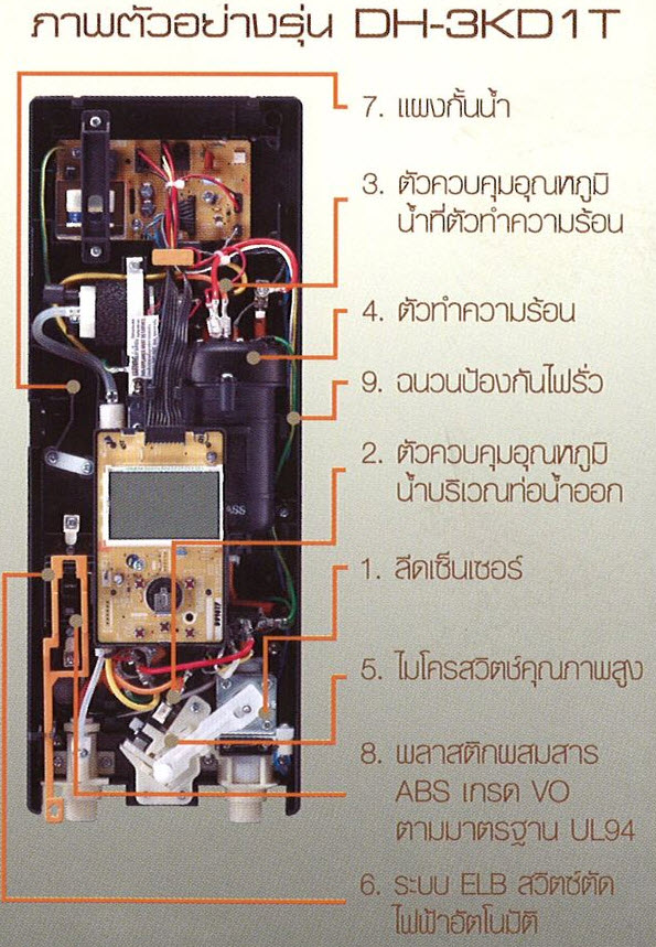 - Auto Thermal cut-off เป็นตัวควบคุมอุณหภูมิน้ำตรงท่อน้ำออก จะตัดกระแสไฟอัตโนมัติทันทีที่อุณหภูมิน้ำร้อนผิดปกติ