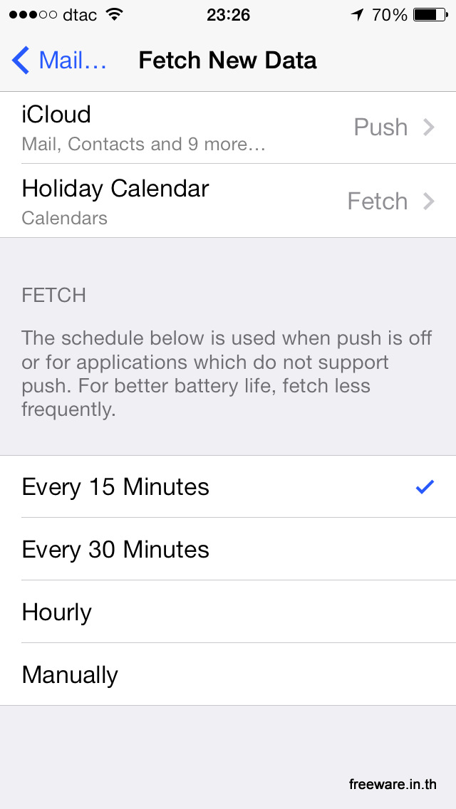 ซึ่งส่วนใหญ่ระบบ Mail จะเป็น Push กัน ซึ่งโคตรเปลืองแบทครับ ให้ไปเปลี่ยนให้เป็น Fetch แทน แล้วกำหนด ระยะเวลาไม่ต้องถี่มาก เช่น 15-30 นาทีต่อครั้ง ก็ทำให้อัตราการกินแบท หายไปได้เยอะเหมือนกันครับ