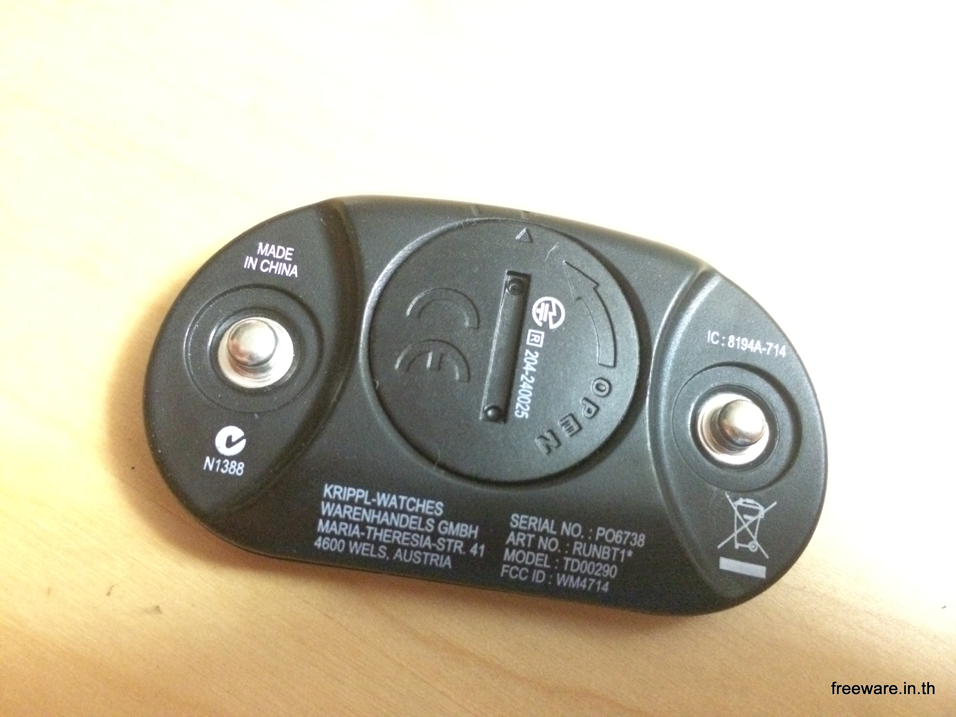 ด้านหลังจะมีหมุดที่เอาไว้ยึดกับสายคาด และก็ใช้ถ่านกระดุมแบบเดียวกับนาฬิกาทั่วไป