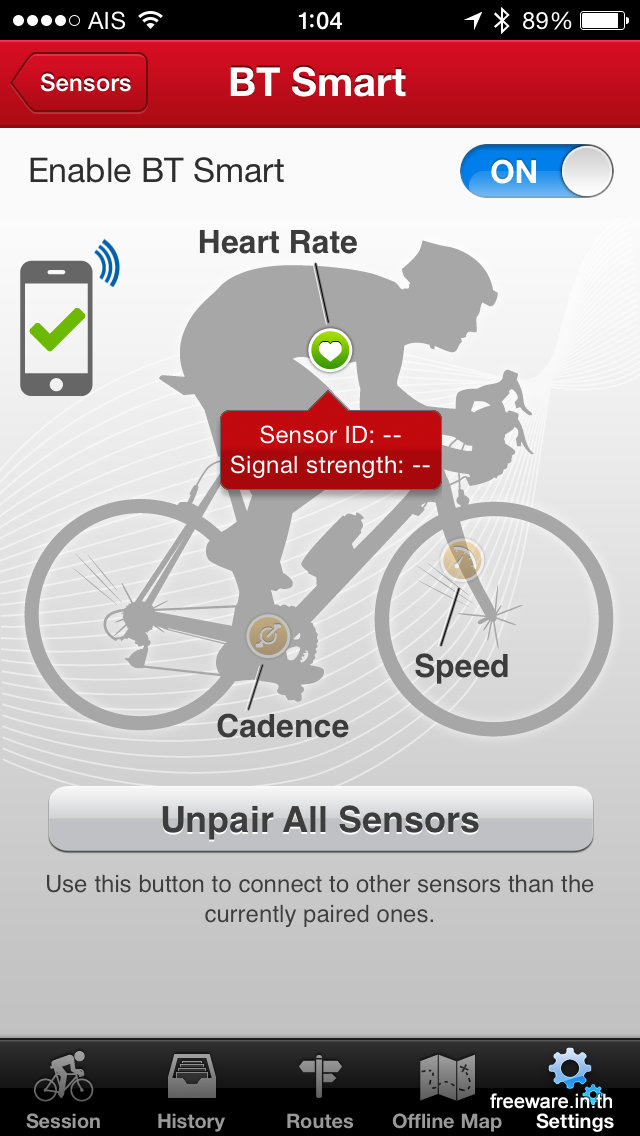 คาดสายทิ้งเอาไว้ก่อนแล้วมาเปิด App นะครับ ให้ไปที่ Setting -> Sensor -> Sensor -> Bluetooth Smart นะครับ คาดไว้ซักพัก สัญลักษณ์รูป Heart Rate จะขึ้นเป็นสีเขียวแบบในรูปครับ