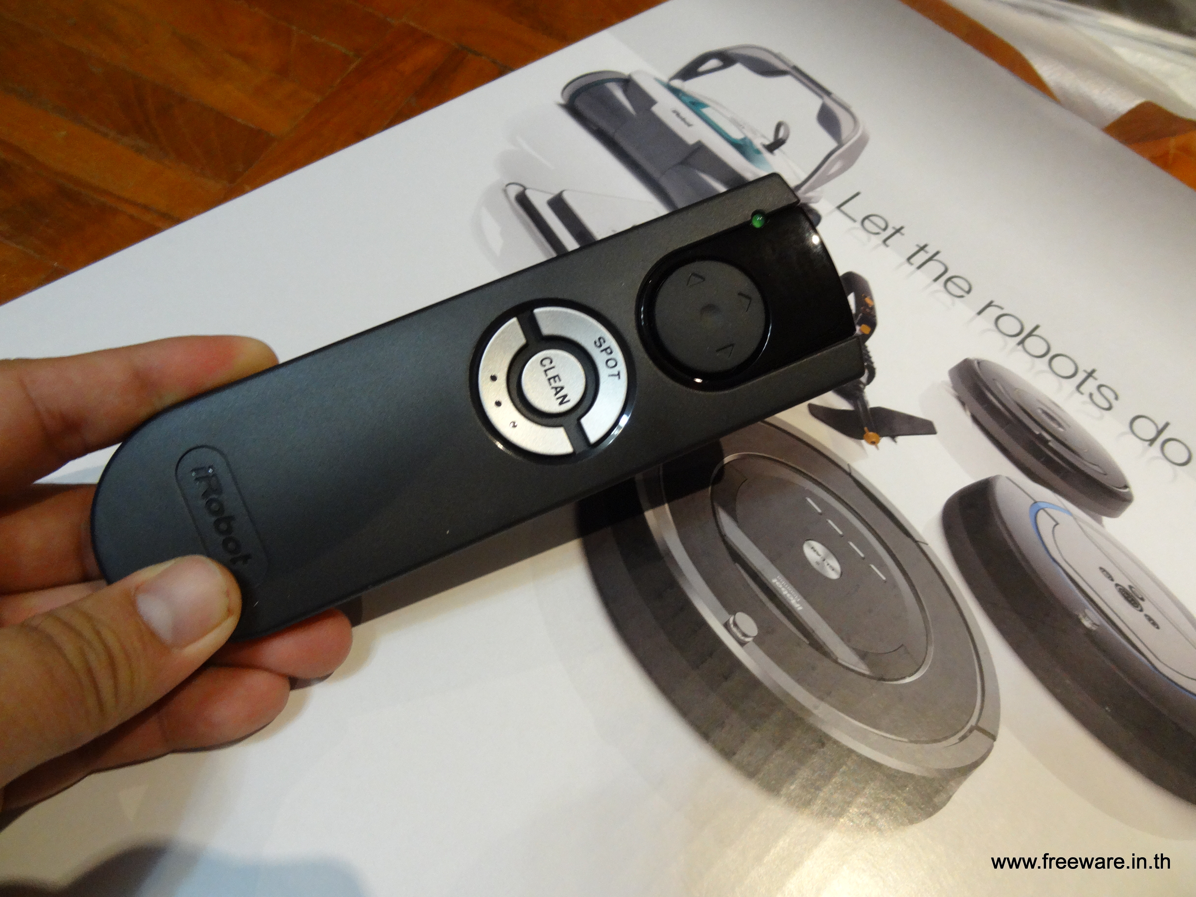 ในรุ่น 800 จะมีรีโมทมาให้ด้วย ซึ่งก็ใช้แบบเดียวกับพวกรถบังคับวิทยุครับ ก็คือสั่งให้ iRobot วิ่่งมาตามจุดที่เราสั่ง แล้วก็กด Spot เพื่อทำความสะอาดเฉพาะจุด หรือ Clean เพื่อทำความสะอาดทั้งห้องก็ได้ครับ