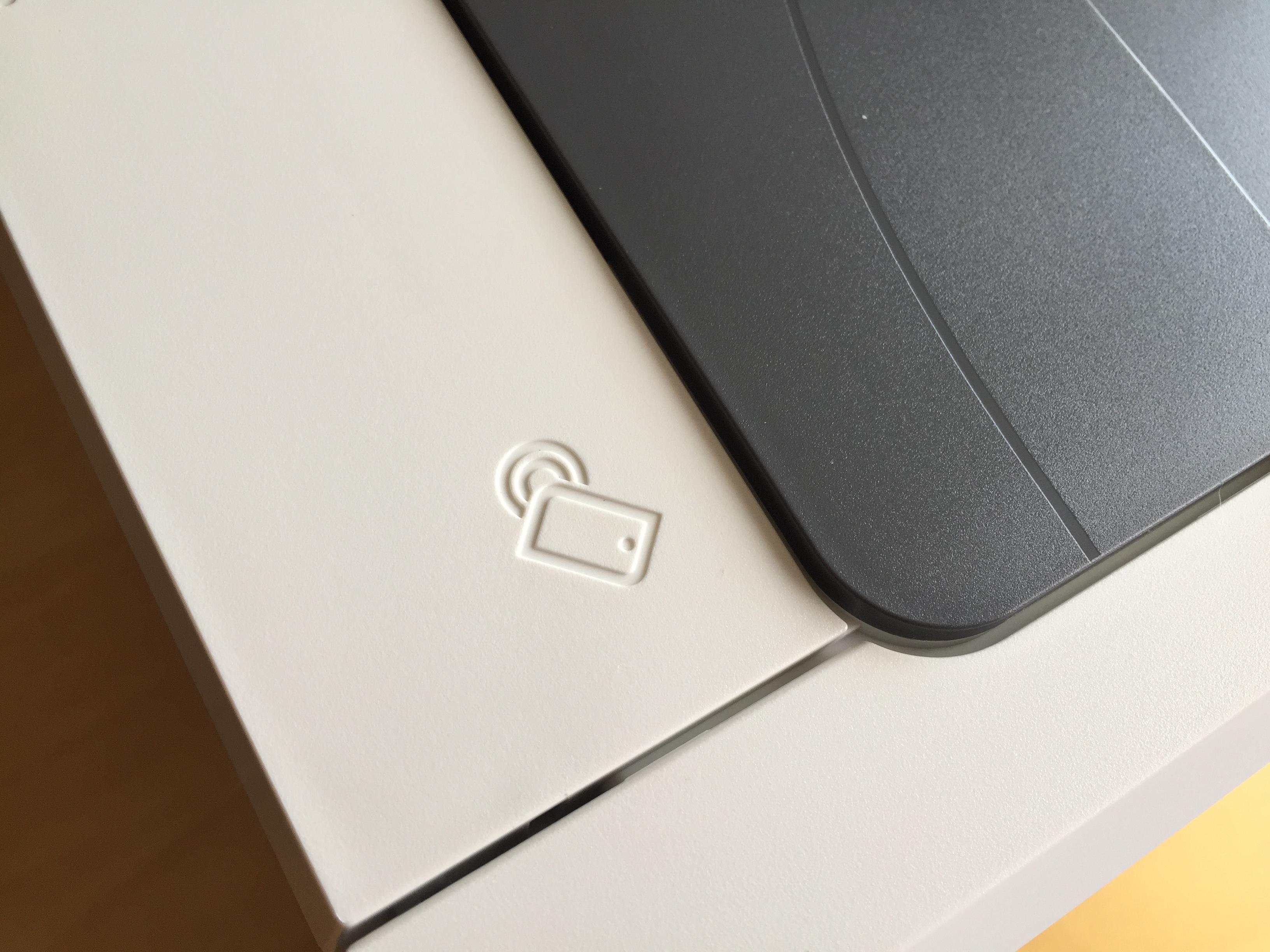 ด้านซ้ายจะเห็น LOGO แบบนี้ แน่นอนว่า มันคือ NFC Receiver ครับ มือถือใครมี NFC สามารถนำมาแปะเพื่อสั่งพิมพ์แบบไร้สายได้เลย