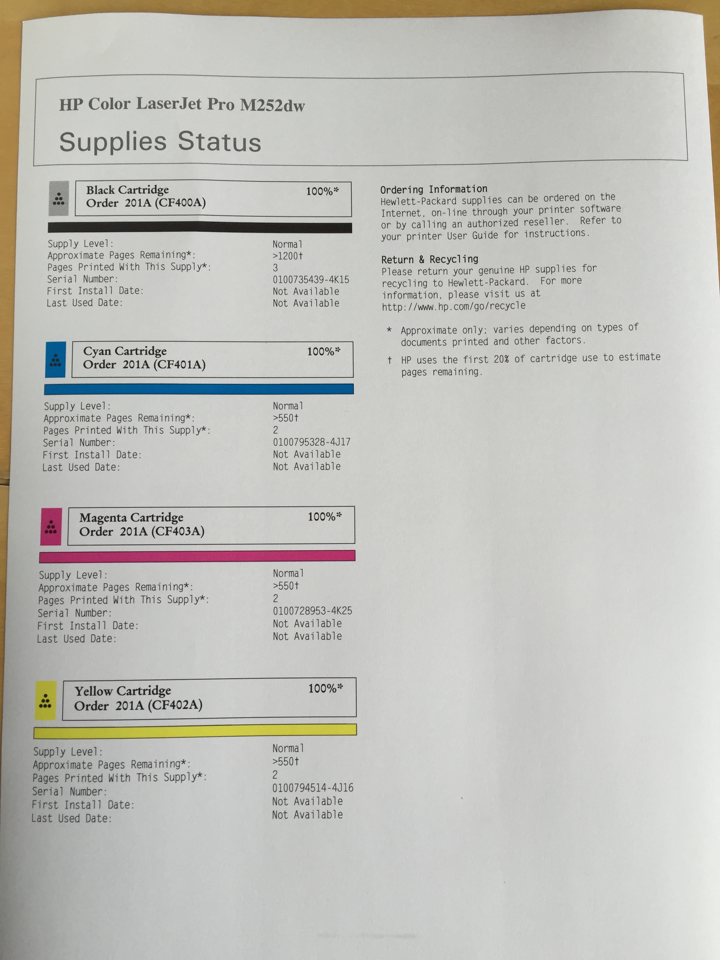 เนื่องจากได้เครื่องนี้มาทดสอบใหม่ๆเลยลองกด Report สถานะของหมึกพิมพ์มาให้ดูซักหน่อยว่าเหลือเท่าไหร่ โอ้โห เต็ม 100% ทั้งสี่ตลับเลยครับพี่น้องไฮโซจริงๆ