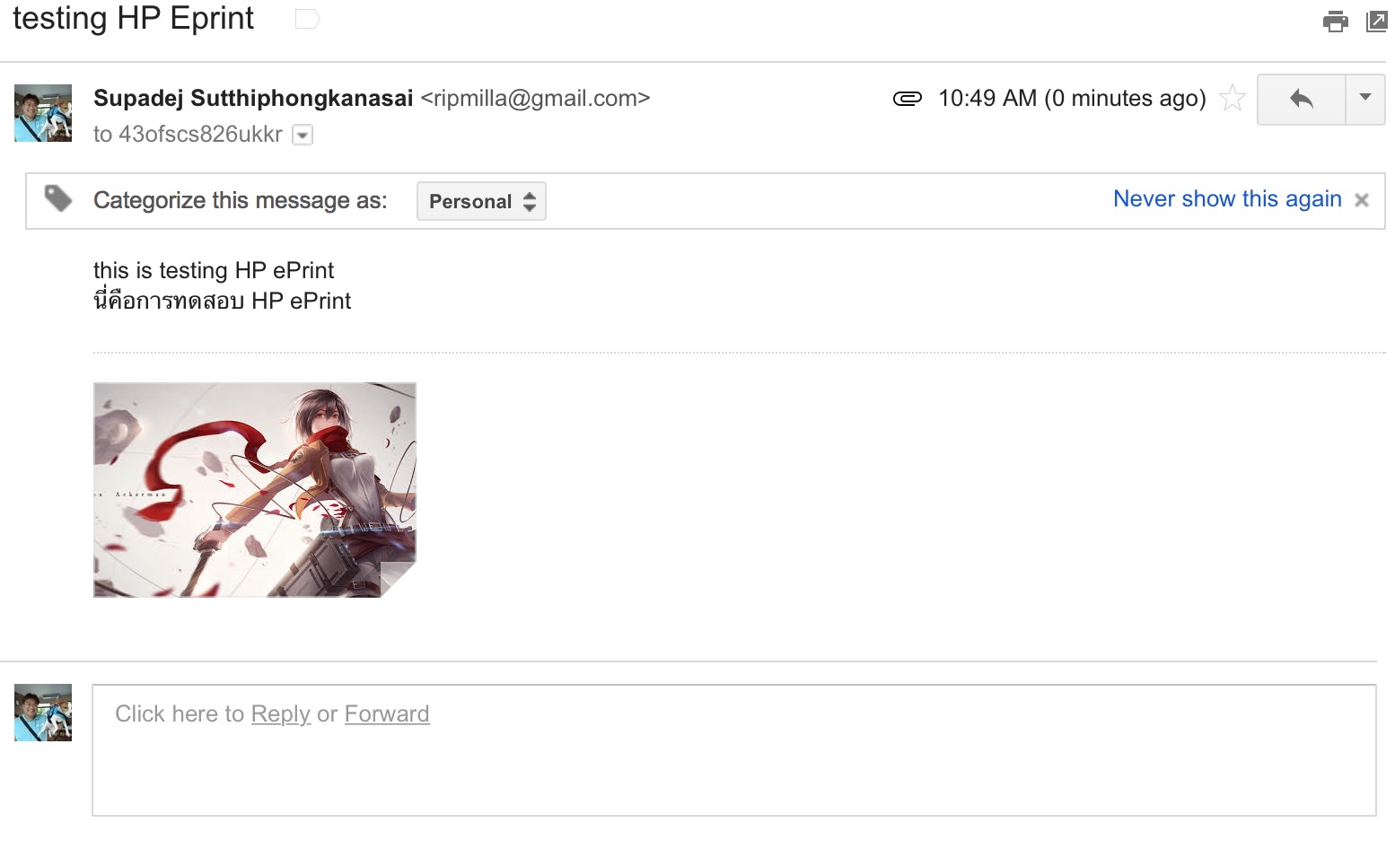 ผมลองส่ง ข้อความ ผสมกับ รูปไป เพื่อทดสอบระบบ HP ePrint นี้ดู โดยที่พิมพ์ข้อความง่ายๆ แล้วก็ข้อความภาษาไทยเข้าไปด้วย