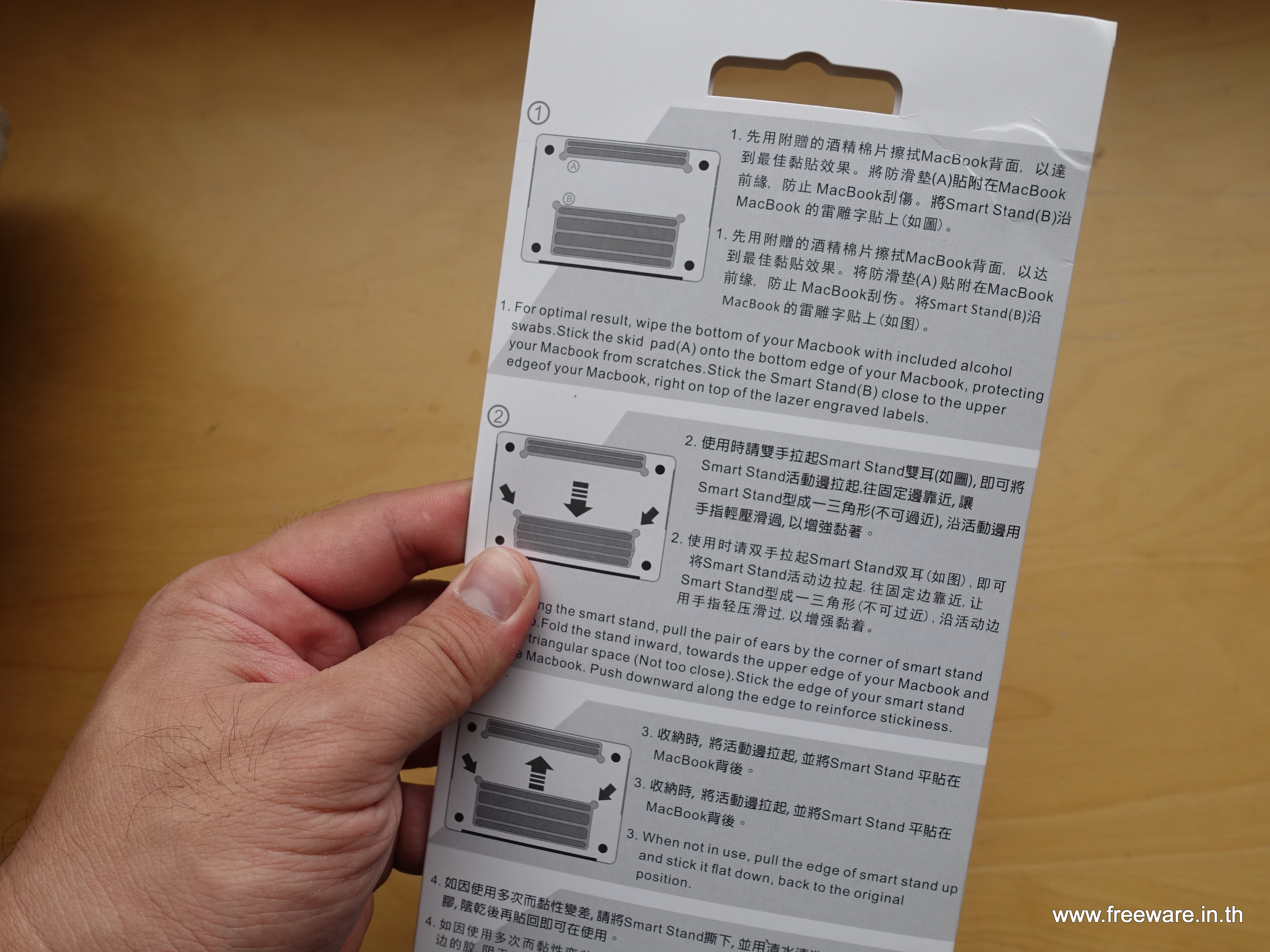 ข้างหลังมีภาพประกอบ พร้อมวิธีติดตั้ง แต่บอกตรงๆ อ่านไม่รู้เรื่องเลยครับ สุดท้ายต้องดูวีดีโอติดตั้งของมันในเว็บ เพราะว่ามันไม่บอกว่า ภาพ Macbook ในรูป ด้านไหนบน ด้านไหนล่าง แล้วไอ้แผ่นที่แปะจะต้องแปะทางไหน เลยต้องดูวีดีโอประกอบเอาง่ายกว่า