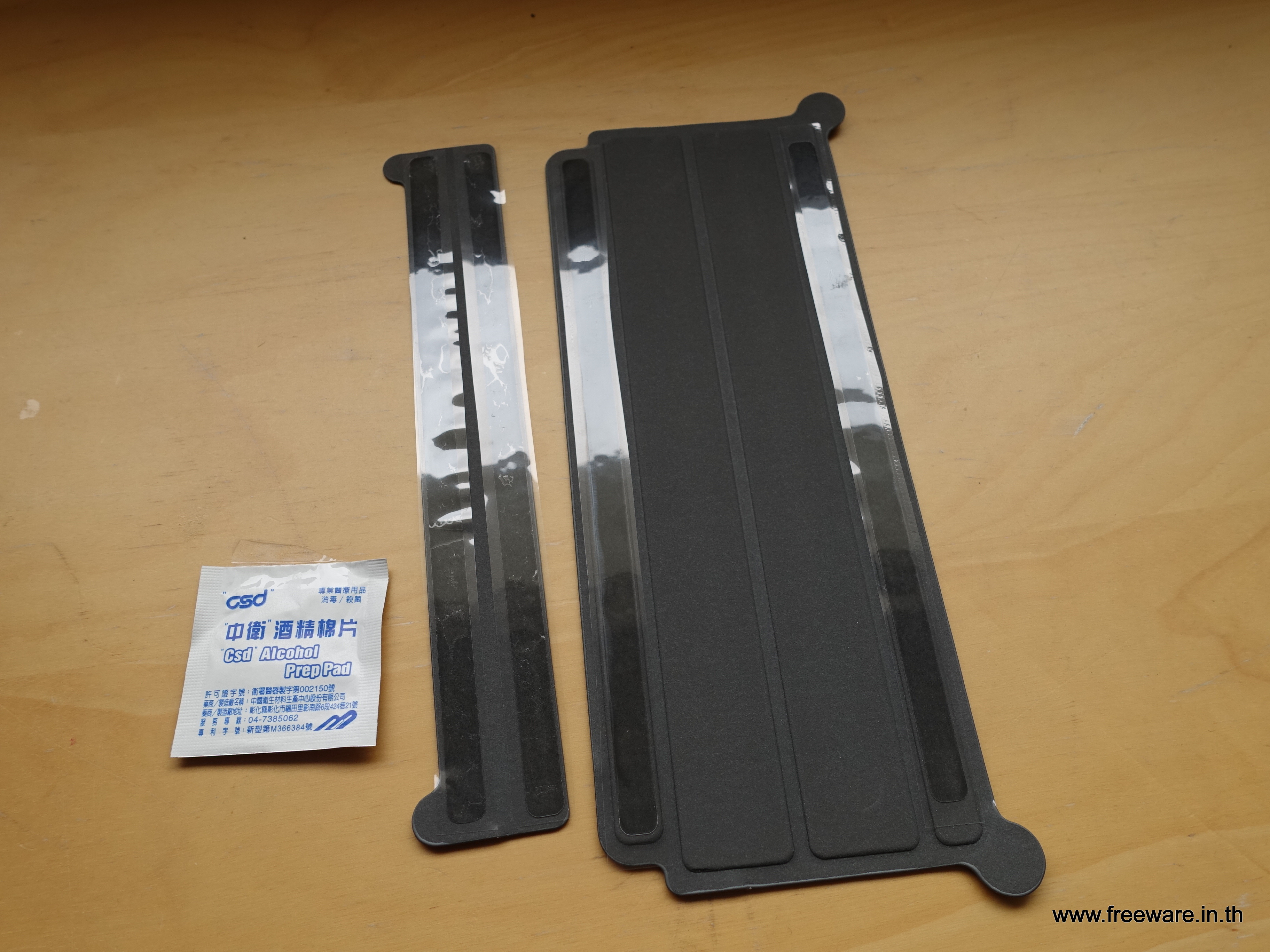 ในซองมีของมาให้ 3 อย่าง มีตัวรอง Macbook Mate ขนาดเล็กกับใหญ่แล้วก็แผ่นแอลกฮอลล์เช็ดทำความสะอาดก่อนติดตั้งครับ