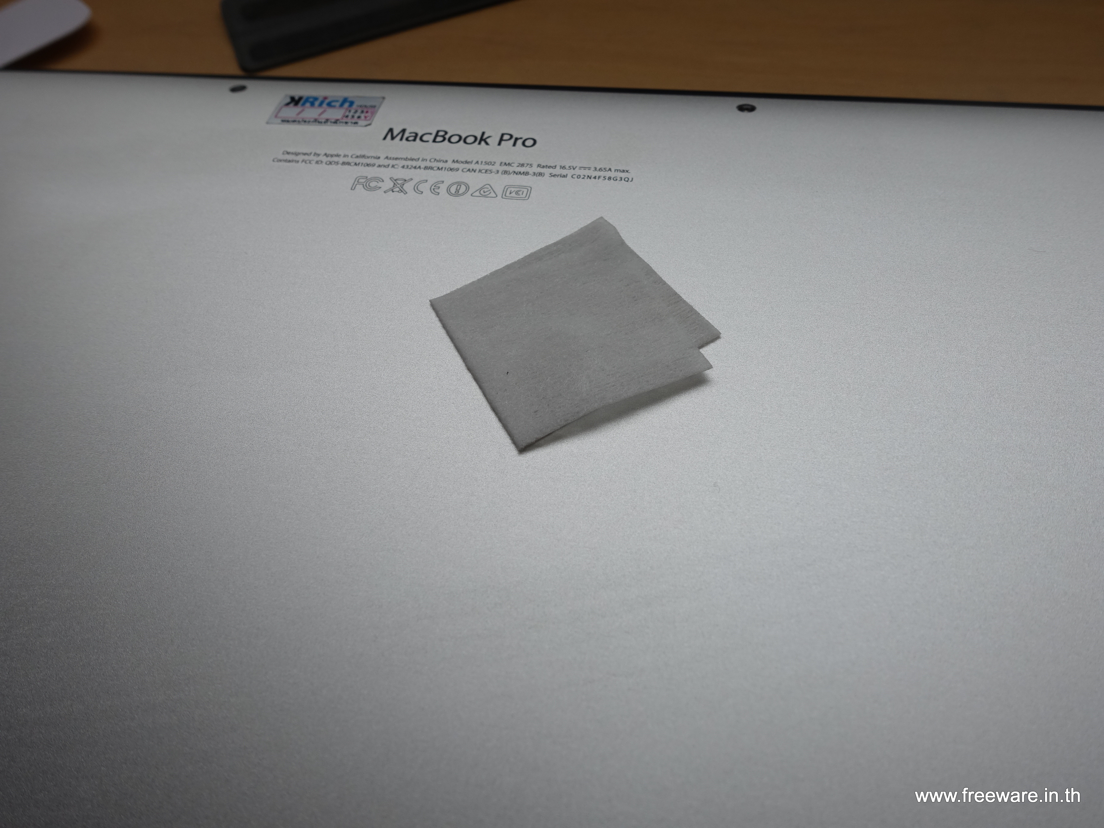ว่าแล้วก็ลองติดตั้งดูครับ เริ่มจากเอาแผ่นแอลกฮอลล์เช็ดก่อน เพื่อให้ฝุ่นที่จับผิวของ Macbook อยู่หลุดไปให้หมด