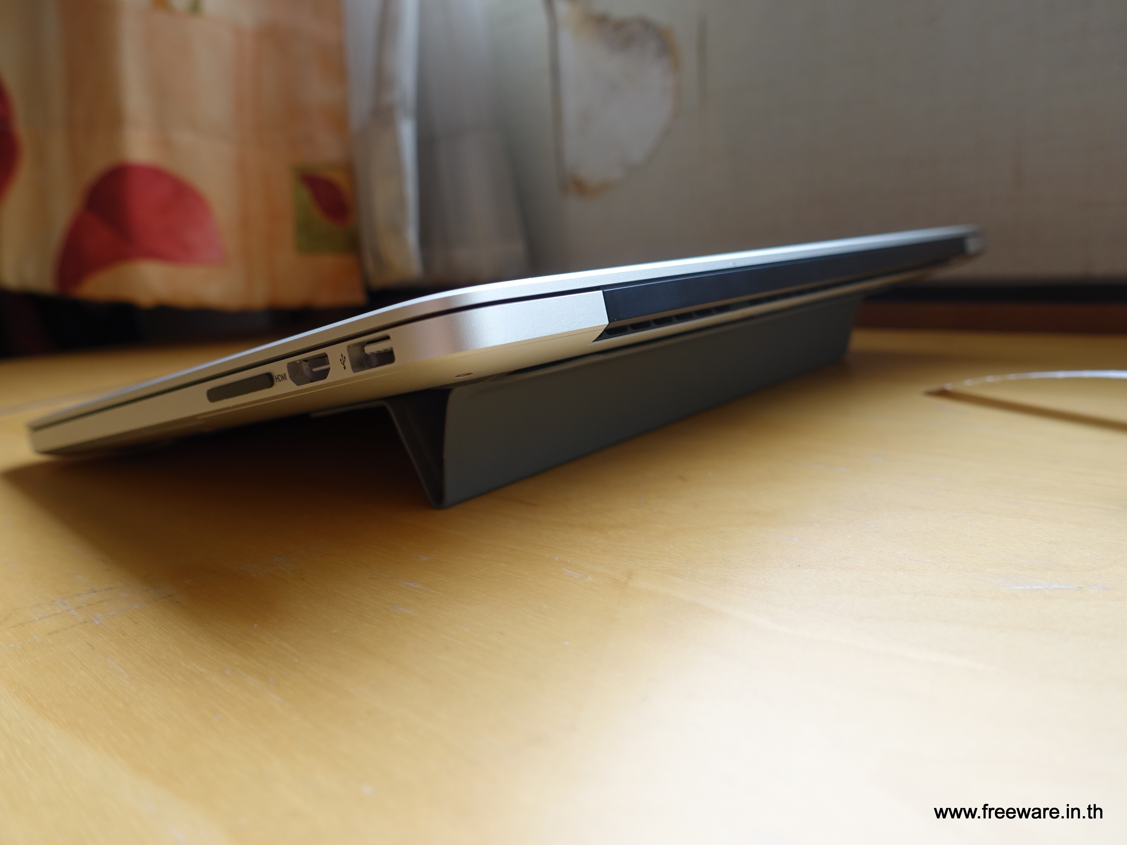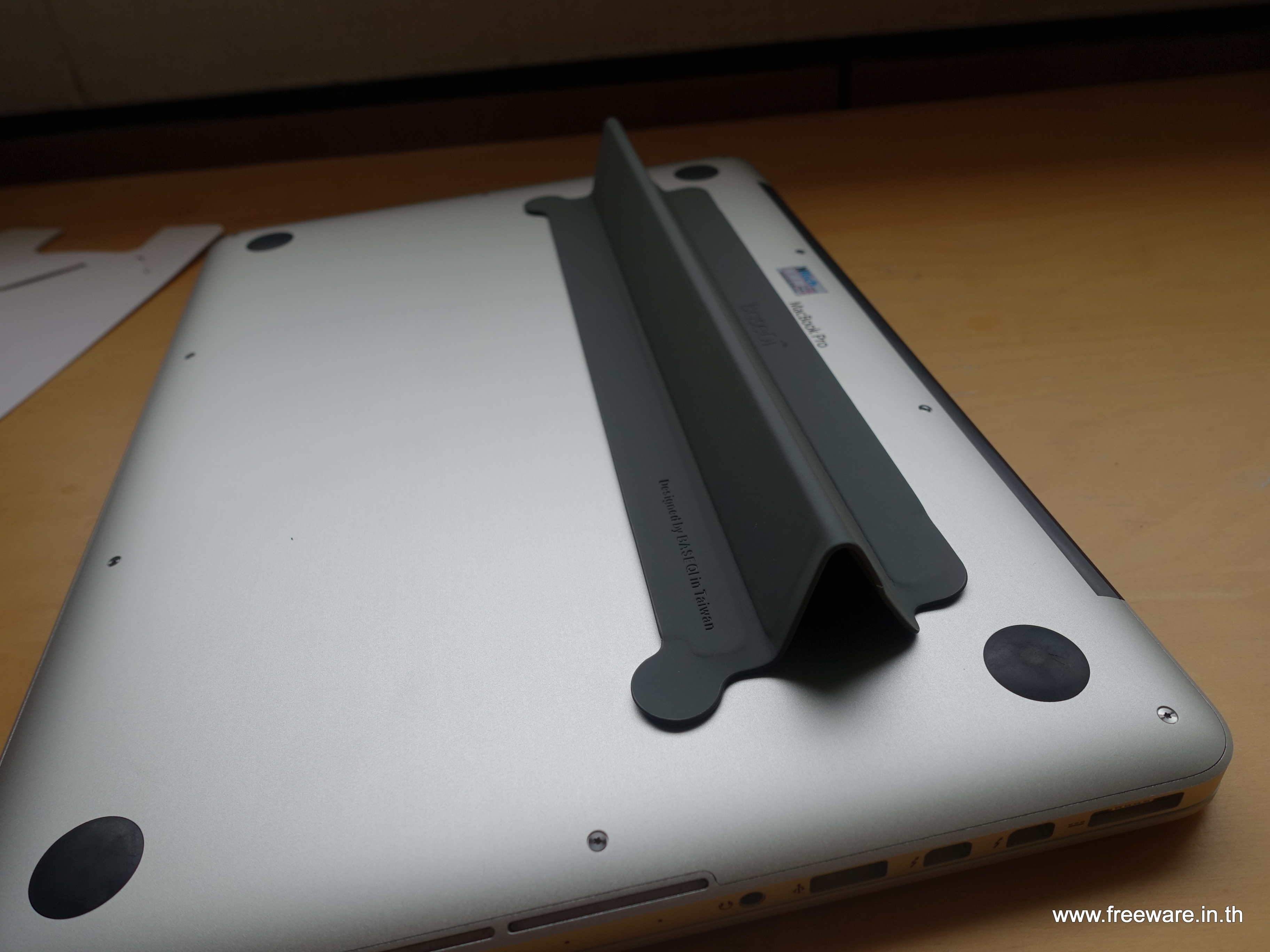 ถ้าจะใช้งานก็หยิบหูหิ้วยกขึ้นมาแล้วเลื่อนตัวฐานจนเกิดเป็นรูปสามเหลี่ยมตามภาพ แค่นี้แหละครับ ไม่มีอะไรมาก น้ำหนักเบา ใช้งานง่าย แถมมีแผ่นแปะอีกแผ่นช่วยป้องกันเครื่องเป็นรอยตอนยกด้วย ซื้อมาในราคา 17$ จากโครงการ Kickstarter .. ซึ่งตอนนี้ก็ไม่รู้จะไปซื้อที่ไหน ยกให้ไปซื้อใน Kickstarter ตาม Link นี้ละกันนะครับ https://www.kickstarter.com/projects/596146300/macbook-mate-ultra-thin-smart-stand-aluminum-dust