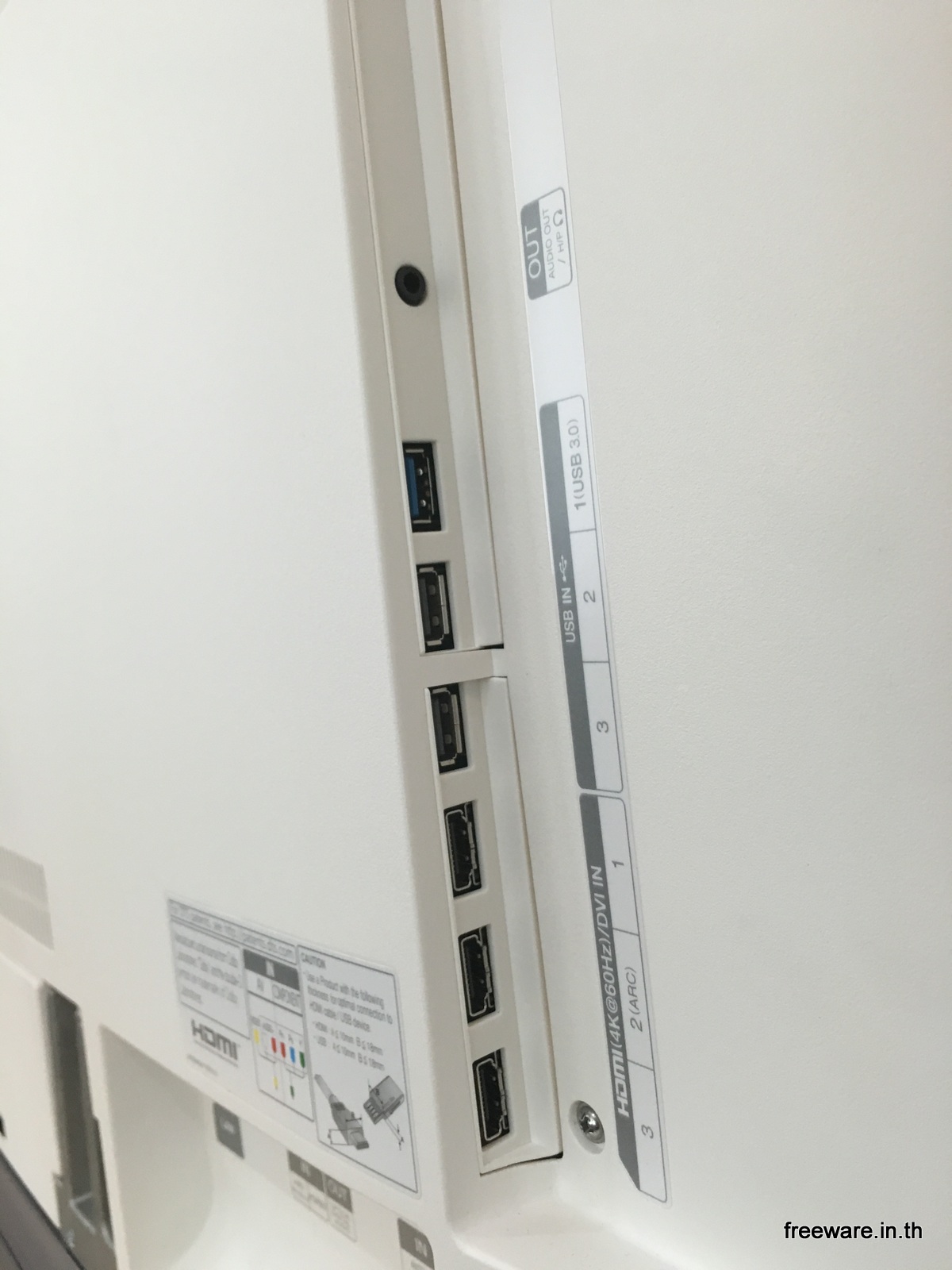 Port ในการเชื่อมต่อเป็น HDMI ที่รองรับความละเอียด 4K ที่ 60Hz ถ้าให้แปลง่ายๆก็คือ มันรองรับการแสดงภาพที่ละเอียดระดับ 4K ที่ Refresh Rate 60 ครั้งต่อวินาทีเลยทีเดียว .. ซึ่งยิ่งภาพละเอียดมาก ก็จะยิ่งมี Refresh Rate ต่ำไปด้วย การที่จะลาก Refresh Rate ให้ได้สูงๆจะต้องมีตัว GPU ภายในที่ทำงานอย่างเร็วมากนั่นเองครับ ที่เหลือก็เป็น Port USB 2.0 x 2 กับ USB 3.0 x 1 ให้ครับ สามารถเอา Keyboard + Mouse เสียบที่ช่อง USB 2.0 แล้วก็เอา External Harddisk แบบ USB 3.0 เสียบเข้าไปเพื่อดูหนังจากในนั้นได้เลย