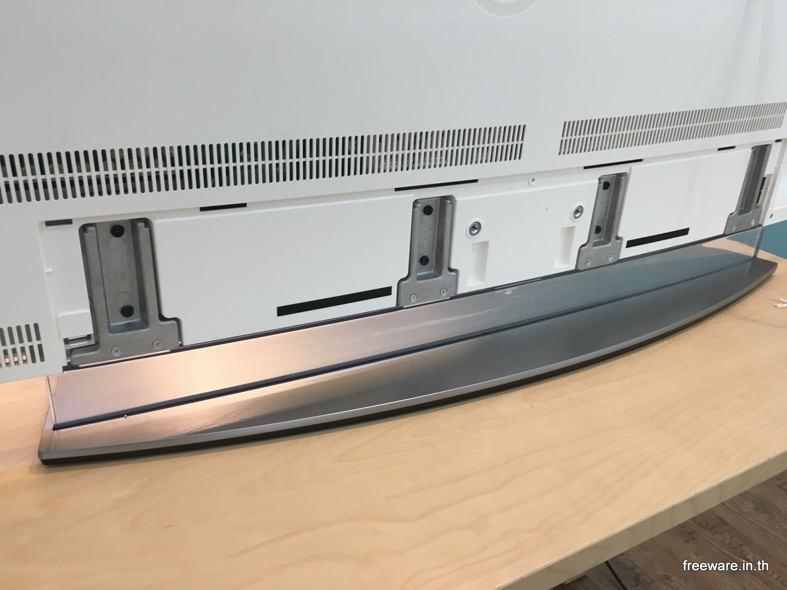 ขาตั้งด้านหลัง ทำจากโลหะ แข็งแรงแน่นอน ตอนประกอบ ผมแนะนำว่าให้วางตัวจอลงบนโซฟา หรือเตียงก็ได้ครับ เพราะหนักมากจริงๆ พอยึดขาเสร็จเรียบร้อยแล้ว ค่อยจับตั้ง ซึ่งเดี๋ยวจะมีแผ่นปิดฝาหลังอย่างดี เพื่อเก็บความสวยงามให้เรียบร้อยครับ