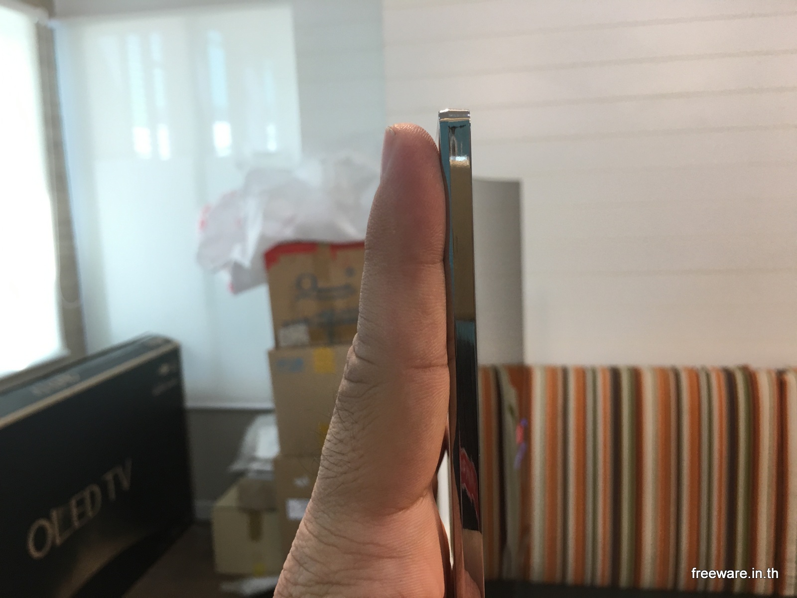 อีกเรื่องที่สำคัญมากของการทำจอ OLED ก็คือ ความบางครับ จอภาพรุ่นก่อนๆ จะมีความหนาระดับนึง เพราะตัวจอภาพไม่สามารถที่จะให้แสงสว่างได้ด้วยตัวมันเอง จึงต้องมีแผง CCFL หรือ LED Backlight ยิงแสงย้อนกลับมาเพื่อให้ภาพมีความสว่างมากขึ้น แต่ก็ทำให้จอหนากว่าเดิมไปด้วย แต่พอเป็นจอภาพแบบ OLED ตัวจอสามารถเปล่งแสงได้ด้วยตัวเอง ทำให้ไม่ต้องยิงแสงจากข้างหลังอีกต่อไป มันเลยบางได้ขนาดนี้เลยล่ะครับ ความบางของจอ LG EG960T ตัวนี้บางเพียง 5.8 มม เท่านั้นเองครับ โอ้แม่เจ้า นิ้วผมยังหนาซะกว่า!!