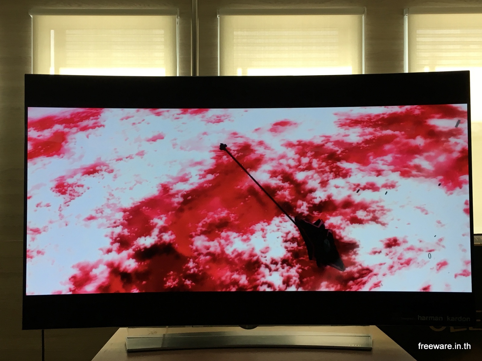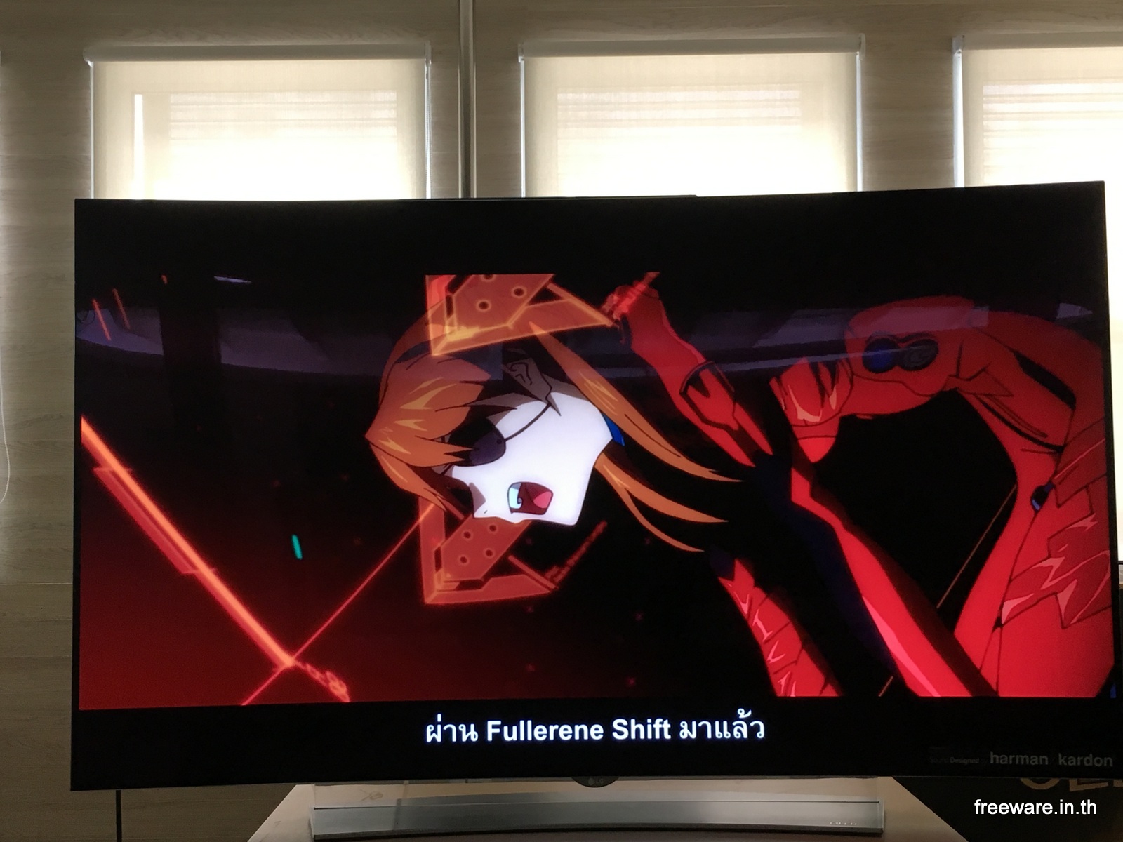 จากงานภาพยนตร์มาดูงาน Anime กันบ้าง ผมทดสอบกับ Evagelian Shingekijouban Q ซึ่งเป็นภาคล่าสุด กับฉากที่ EVA-02 ขึ้นไปสู้กับเทวทูตบนอวกาศ ที่เลือกฉากนี้ก็เพราะอยากดูฉากอวกาศมันส์ๆนี่แหละครับ ตัวจอมีเทคโนโลยีชื่อ Clear Motion ที่ทำให้การแสดงผลลื่นนวลตา ดูแล้วไม่ตาลาย ผลก็คือ ตัว Anime สีสดสมจริง การเคลื่อนไหวในฉากต่อสู้ที่ฉับไว แต่ไม่ตาลายปวดหัว ภาพนุ่มลื่นไหลเหมือนเคี้ยวเนื้อวะกิวเกรด 5 จริงๆเลย โอ๊ยยย มันช่างแจ่ม