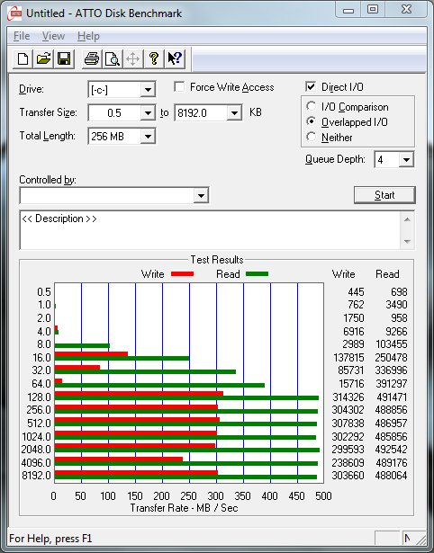 สำหรับ ATTO Disk Benchmark ก็เห็นชัดเลยว่า ความเร็วอ่านเขียนค่อนข้าง สม่ำเสมอ คือ ค่า Read นี่ทะลุไปถึง 500 ก็มี ส่วนค่า Write ก็จะวนๆอยู่แถว 250MB – 300MB ครับ