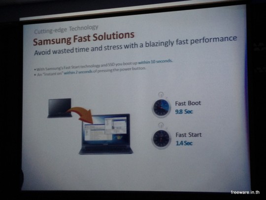 การบูทที่โคตรเร็วมากๆของ Samsung Series 9 เป็นอีกเรื่องที่ผมโคตรชอบครับ คือส่วนตัวผมเองก็ใช้ Thinkpad T420 + SSD ของ OCZ รุ่น Vertex4 นี่ก็เร็วมากอยู่แล้ว แต่ Samsung Series 9 จะมีระบบ Fast Start ที่ทำให้ฟื้นจากสถานะ Sleep โดยใช้เวลาแค่ 1.4 วินาทีเท่านั้น แถมยังฟื้นจากสถานะ Hibernate ก็ใช้เวลาแค่ 9.8 วินาทีเท่านั้นครับ ซึ่งผมได้ทดสอบแล้วเอาวีดีโอมาให้ดูด้วยครับ ลองกดดูเลยครับ ใช้เวลาประมาณ 7-8 วินาทีเท่านั้น ก็ฟื้นจากสถานะ Hibernate มาพร้อมทำงานแล้ว (จริงๆตัวคลิปที่ผมทดสอบ ผมทดสอบจาก Shutdown เลยด้วยซ้ำไม่ใช่ Hibernate)