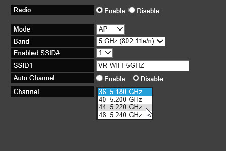 สำหรับการ Setup Wireless แบบ 5Ghz ก็จะมี Channel มาให้เลือกดังต่อไปนี้ ซึ่งแต่ละ Channel นั้น กำหนดมาแล้วว่าจะไม่ทับซ้อนกันอย่างแน่นอน