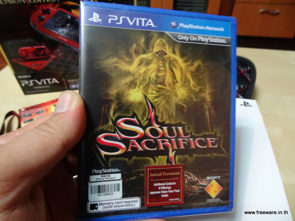 • ตัวเกม Soul Sacrifice แบบแท้ (เดี๋ยวนี้ไม่ใช้แผ่นแล้ว แต่ให้เป็น Memory Card แบบเฉพาะกิจของ PS Vita