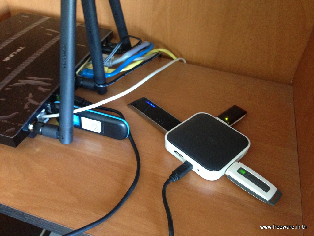 ไอ้ความเจ๋งอีกอย่างของเจ้า TD-W8970 ก็คือ เราสามารถทำ File Server ได้ใช่ไหมครับ แต่ผมลองอ่านคู่มือแล้ว มันบอกว่า สามารถใช้งานได้ 2 อุปกรณ์ 8 Partition พร้อมๆกัน และเสียบได้สูงสุด 4 ตัว 18 Partition ด้วยกัน ผมก็เลยลองเสียบ USB Hub เข้ากับตัว Router แล้วก็ยัด Flashdrive ไปเยอะๆ เพื่อดูว่าทำได้จริงไหมปรากฏว่า!!