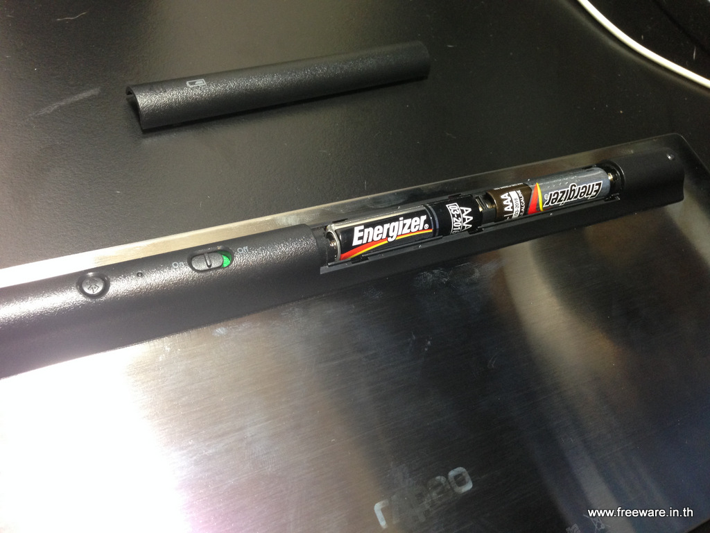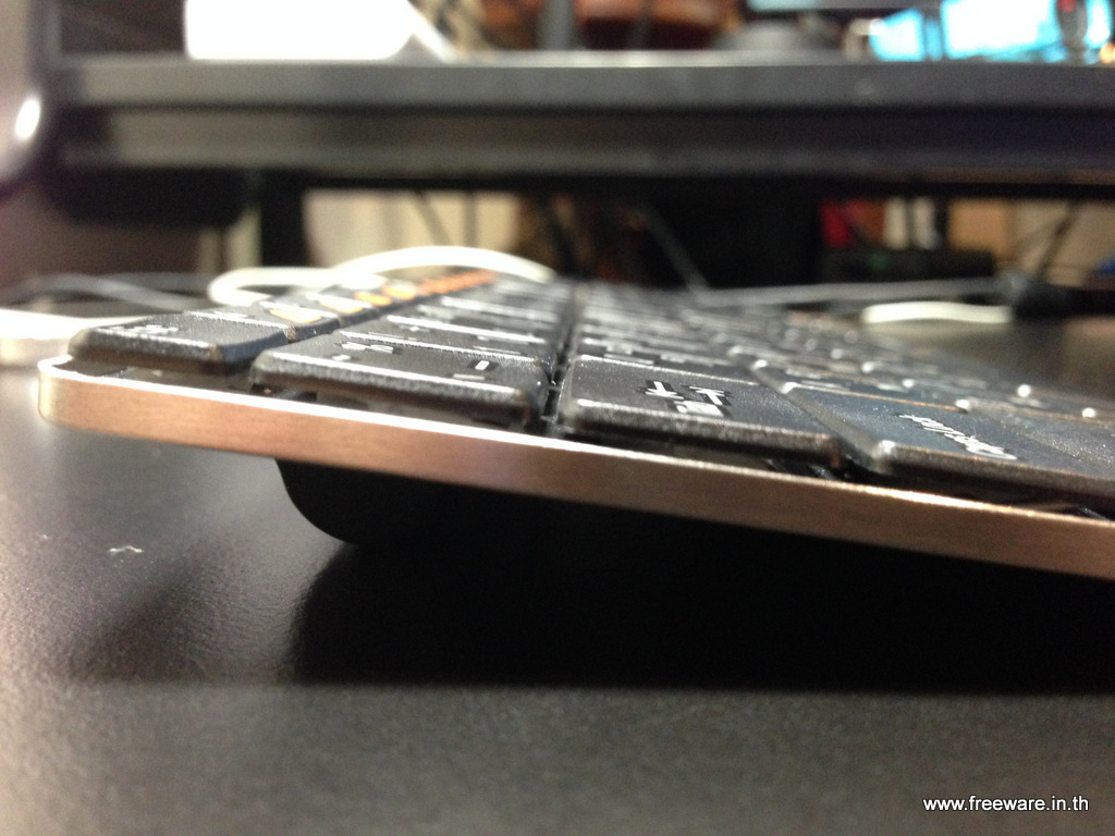 ความบางของ Keyboard ตัวนี้คือ 5.6 มม. และมีถาดใส่ถ่านนูนออกมาเพื่อทำหน้าที่เป็นตัวยก Keyboard ให้พอดีมือ