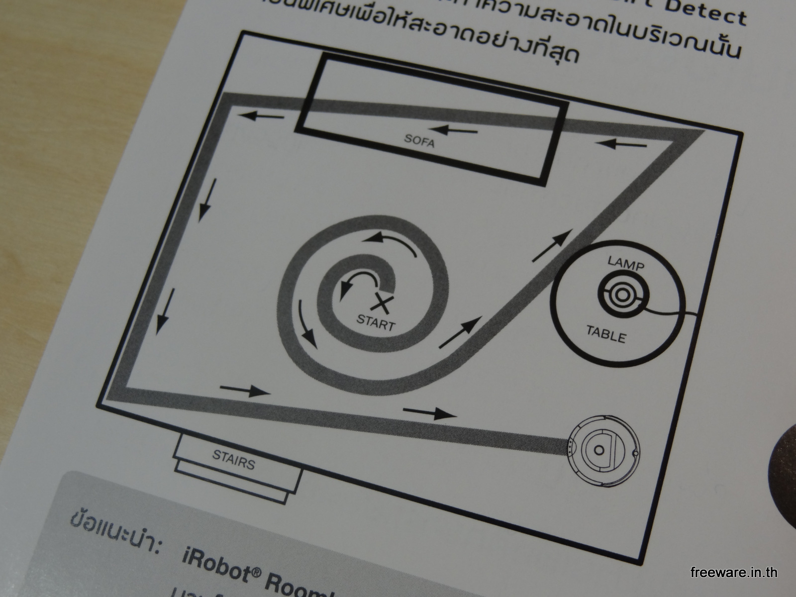 เทคนิคการวิ่งทำความสะอาดของ iRobot ไม่ใช่วิ่งกวาดพื้นแบบ ซ้าย-ขวา ไปเรื่อยๆจนทั่วห้องนะครับ ระบบจะเช็คกับ Home Base ว่า ตัวมันอยู่ตรงไหน / Home Base อยู่ตรงไหน แล้วก็จะยิ่ง sensor ออกมาวัดขนาดห้องว่ามีรัศมีเท่าไหร่ จากนั้นมันก็จะวิ่งเป็นก้นหอย รอบห้อง เพื่อให้คลอบคลุมทั้งหมด แล้วก็วิ่งเก็บขอบครับ