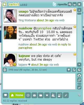 เมื่อเราออนไลน์ได้แล้ว ทาง Twhirl ก็จะไปโหลดเรา Timeline ของเรามาแสดงผล ซึ่งการแสดงผล สามารถเลือกหมวดหมู่การแสดงผลได้อีกด้วย ว่าจะเอาหน้ารวม / หน้าที่มีคนพูดถึงเรา หรือ หน้า Direct Message ที่ส่งข้อความหาคุณโดยตรง ผ่านทางการเลือกปุ่มข้างล่างนะครับ