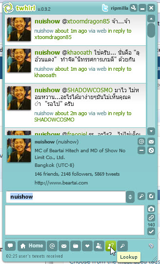 ในที่สุด กระแสของ Twitter ก็ดังเป็นพลุแตก อันเมื่อเกิดเหตุการทักทายผ่าน Twitter ของ ท่านนายก และ อดีตนายก ก่อให้เกิดกระแสสังคมจะเกิดการพูดถึงในวงกว้าง … @nuishow นายห้างออกผม ไปออกข่าววันใหม่เรื่อง Twitter แค่ 5 นาที กลับมามีคน Follow ตามอีกเป็นพัน.. ไม่ค่อยอยากจะสอนเรื่องของการ Tweet มากนัก เพราะมีหลายเว็บ พูดเยอะแล้ว รวมไปถึง @sugree อธิบายไว้ดีมากแล้วใน Manager.co.th ไปตามอ่านได้ที่โน่น วันนี้จะขอเสนอโปรแกรมช่วยเล่น Twitter แบบง่ายๆครับ