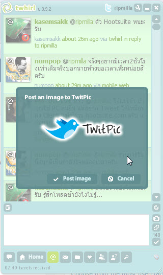 ถ้าอยากจะส่งรูปเข้าไปใน Twitter ทาง Twhirl ก็เชื่อมกับ Twitpic.com จากนั้นก็ Upload รูปของเราเข้าไปทันทีครับ