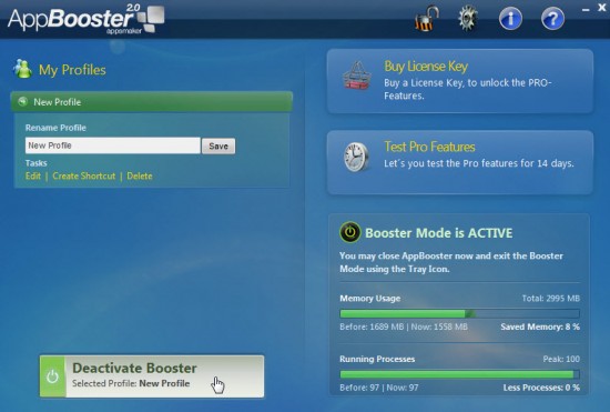 ด้วยการใช้โปรแกรม AppBooster ก็จะทำให้เราสามารถ เปิด/ปิด พวกบริการต่างๆในเครื่องได้ง่ายและสะดวกมากขึ้น เช่นถ้าเราจะเล่นเกมแรงๆ ก็ปิดบริการอื่นๆไปให้หมดเลย พอเล่นเกมเสร็จ ค่อยกลับมาเปิด Service ทั้งหลายคืน ทำให้ Windows เรากลับมาเหมือนเดิม แบบนี้ก็ไม่เลวนะครับ