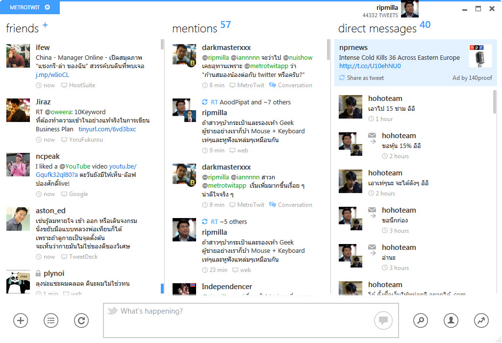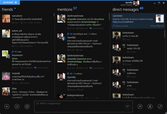 ไม่ได้อัพเดทโปรแกรม Twitter Client มานานแล้ว พอดีเห็น @iannnnn โพสต์มาใน Twitter ว่า ติด MetroTwit งอมแงม เลยตัดสินใจลองบ้างดีกว่า หลังจากทดสอบแล้วพบว่า สมควรจัดลง Freeware.in.th ยิ่งนัก เลยเอามาแนะนำซะเลย