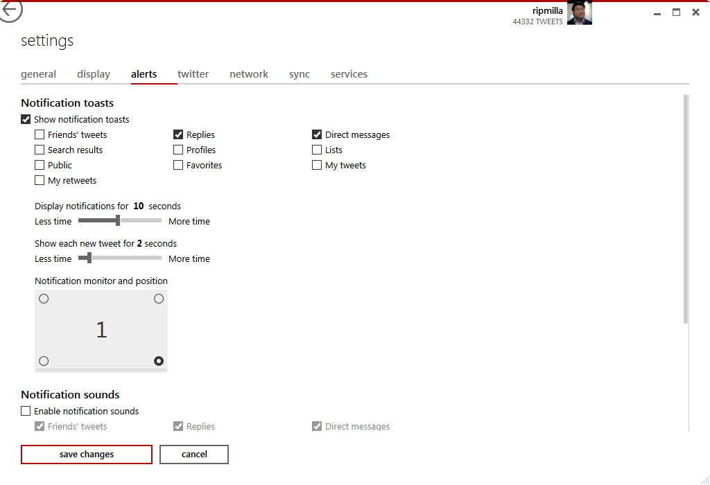 มีระบบ Alert ที่แจ้งเตือนแทบจะทุกอย่างเกี่ยวกับ Twitter เช่นใคร Mention คุณ , ใคร Update , ใคร Retweet ก็สามารถรู้ได้ทั้งหมดแถมยังสามารถ เลือกจุดในการผุด Notification ขึ้นมาได้อีก 4 จุดรอบจออีกต่างหาก