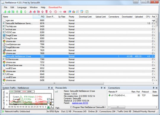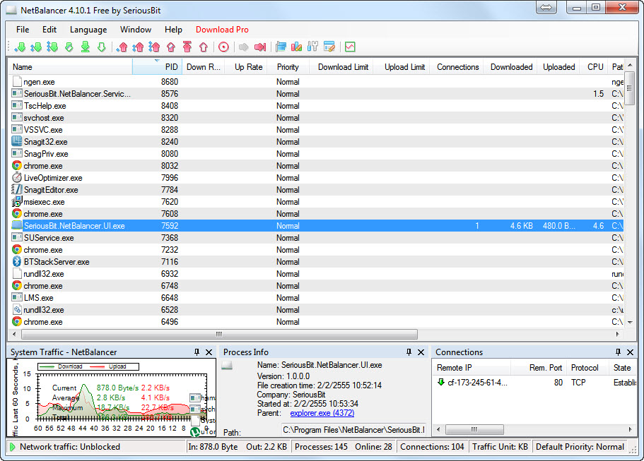 โปรแกรมตัวนี้ชื่อ SeriousBit Net Balancer Free เป็นโปรแกรมที่เอาไว้ Monitor ดูพวกความเคลื่อนไหวของ Network ในเครื่องเรา ว่ามีโปรแกรมไหนใช้งานอะไรกันอยู่บ้าง ซึ่งมันช่วยเหลือ เจ้าของเครื่องอย่างเราๆเยอะมากนะครับ เอาง่ายๆ ถ้าเกิดคุณโดนไวรัสหรือ Trojan เล่นงาน อย่างน้อยคุณก็จะรู้ได้ว่า เจ้าไวรัสแปลกๆนั่นมันรันมาจากที่ไหนของเครื่องคุณอะไรแบบนี้