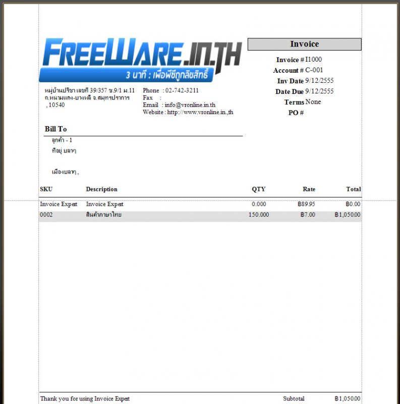 อีกเรื่องก็คือ การกรอกข้อมูลภาษาไทย .. ตัวนี้ก็รองรับได้ปกติครับ สามารถใช้ภาษาไทยได้ทุกจุดของเอกสาร ซึ่งเมื่อพิมพ์ออกมาแล้ว ตัว Invoice จะมีหน้าคาแบบนี้เลยครับ