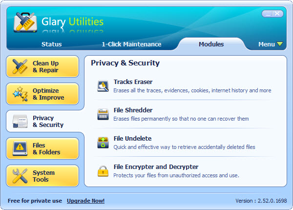 หมวดนี้จะเป็นการจัดการกับความเป็นส่วนตัวของเราครับ ใช้ลบพวก Cookie ใน Browser , ลบไฟล์แบบกู้ไม่ได้ด้วย File Shredder แถมมีโปรแกรมกู้ไฟล์ที่เผลอลบไปมาให้อีก และถ้าเกิดอยากจะเก็บไฟล์ไหนเป็นความลับไม่ให้ใครเปิดดู ยังมีตัวเข้ารหัสไฟล์มาให้เราอีกด้วยครับ