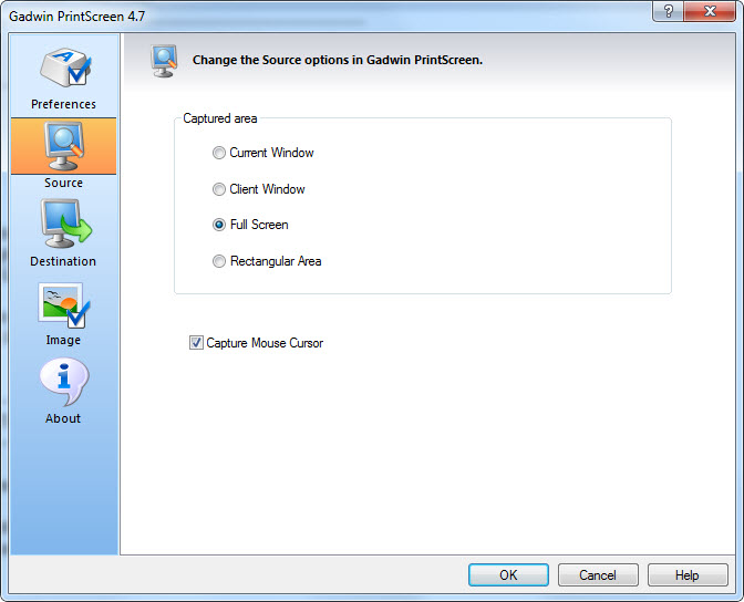 สามารถเลือกพื้นที่ในการจับภาพได้ เช่น หน้าต่างของโปรแกรมที่กำลังเปิดอยู่ , หน้าจอ Full Screen หรือ พื้นที่ที่เราเลือกแบบกำหนดโซนได้ และที่สำคัญยังเลือกว่าจะเอาภาพ Cursor ของ Mouse ได้หรือเปล่าด้วยก็ได้ครับ