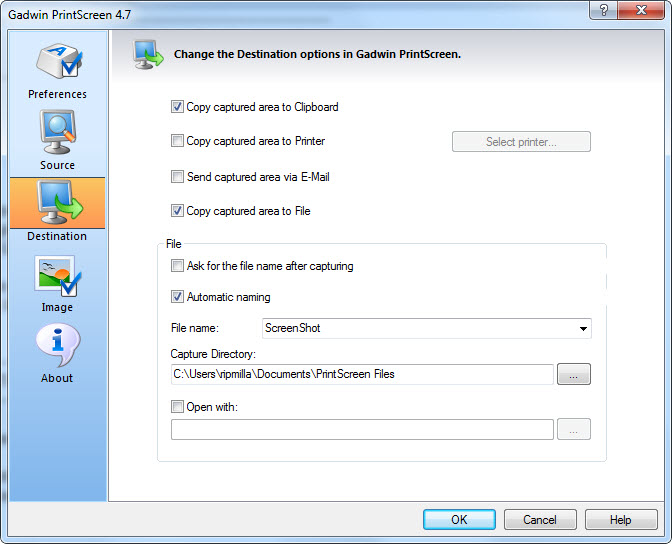 ถัดจากเลือกว่าจะ Capture อะไร ก็เป็นการ Capture แล้วไปไหน ซึ่งเราสามารถ เลือก Capture แล้วส่งไป Clipboard , Printer , Email หรือจะเก็บลงไฟล์ก็ได้ แถมยังเลือกโฟลเดอร์ได้ด้วยว่าจะบันทึกไว้ตรงไหน ซึ่งจะมีระบบตั้งชื่อไฟล์อัตโนมัติมาให้ด้วยครับ