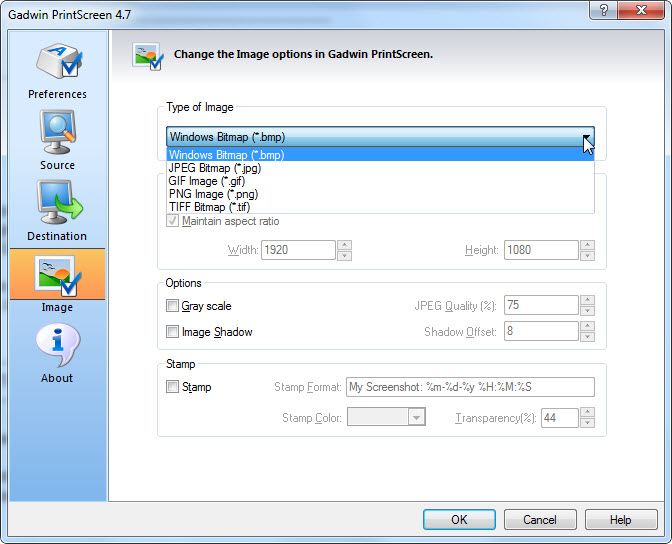 ในกรณีที่บันทึกเป็นไฟล์ ก็สามารถเลือกได้ด้วยว่าภาพจะเป็นนามสกุลอะไร , ภาพสีแบบไหน คุณภาพความละเอียดเท่าไหร่ หรือ ติด Stamp ลงไปในภาพได้ว่า จะมีข้อความอะไรบ้าง กรณีนี้ใช้เป็นลายน้ำในเว็บก็ได้นะครับ